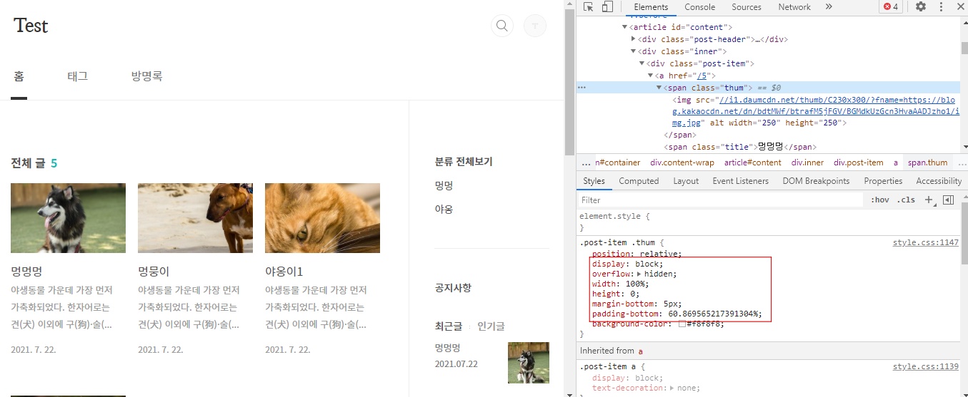 CSS 부분을 살펴보면, span.thum 요소는 부모 요소에서 넓이를 제어하고 높이는 0으로 잡아두고 실질 높이는 padding-bottom으로 조절하고 있음을 알 수 있습니다.